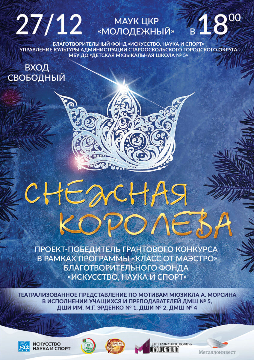 «Снежная королева» — это проект — победитель грантового конкурса Благотворительного фонда «Искусство, наука и спорт» в рамках культурной платформы АРТ – ОКНО по направлению «Класс от Маэстро».