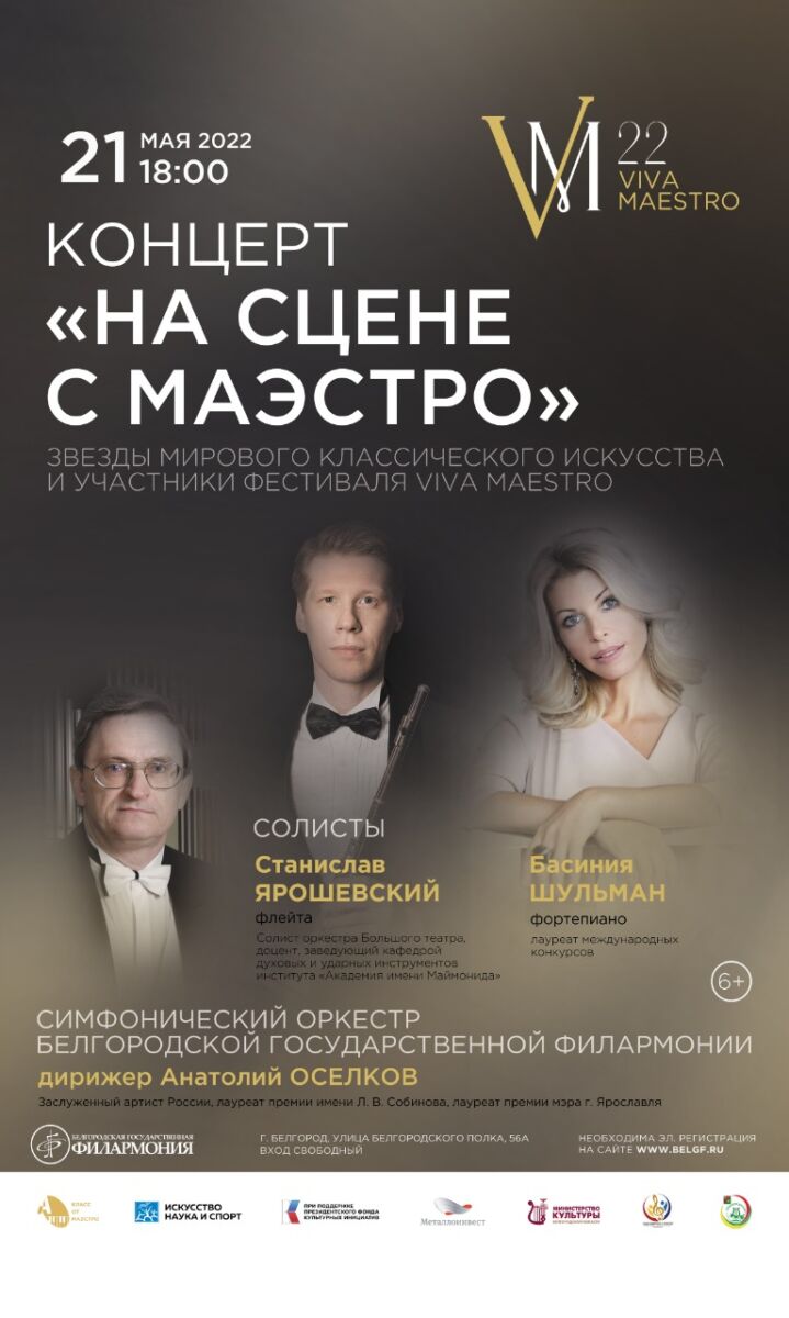 21 мая в 18.00 в Белгородской государственной филармонии состоится концерт «На сцене с маэстро» с участием звезд мирового классического искусства и участников Межрегионального фестиваля «Viva Maestro!» в сопровождении симфонического оркестра Белгородской государственной филармонии под управлением главного дирижера, заслуженного артиста России Анатолия Оселкова.