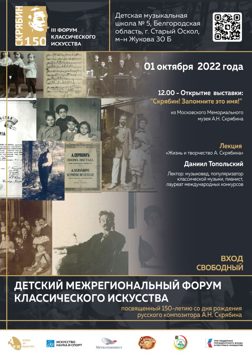 01 октября 2022 года в 12.00 в Детской музыкальной школе №5 в рамках Детского межрегионального Форума классического искусства состоится открытие выставки «Скрябин! Запомните это имя!», экспозиция которой предоставлена Московским Мемориальным музеем А.Н. Скрябина.