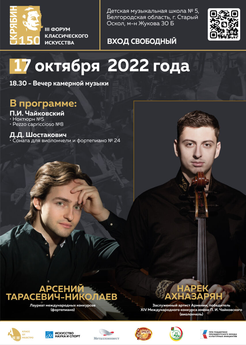 17 октября в 18.30 в Детской музыкальной школе №5 г. Старый Оскол состоится концерт выдающихся музыкантов. Впервые в Белгородской области выступят заслуженный артист Армении, победитель XIV Международного конкурса им. П.И. Чайковского Нарек Ахназарян (виолончель) и лауреат международных конкурсов Арсений Тарасевич-Николаев (фортепиано).