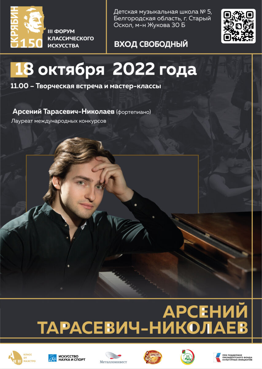 18 октября 2022 года в 11.00 в Детской музыкальной школе №5 (м-н Жукова, 30Б) состоится творческая встреча с Арсением Тарасевич-Николаевым, преподавателем Московской государственной консерватории им. П.И. Чайковского. Музыкант становился лауреатом крупнейших конкурсов, таких как: Кливлендский Международный конкурс пианистов (США, 2013), Международный конкурс пианистов им. Э. Грига (Норвегия, 2014), Сиднейский Международный конкурс пианистов (Австралия, 2016). Арсений также проведет мастер-классы для участников Форума по специализации «фортепиано».