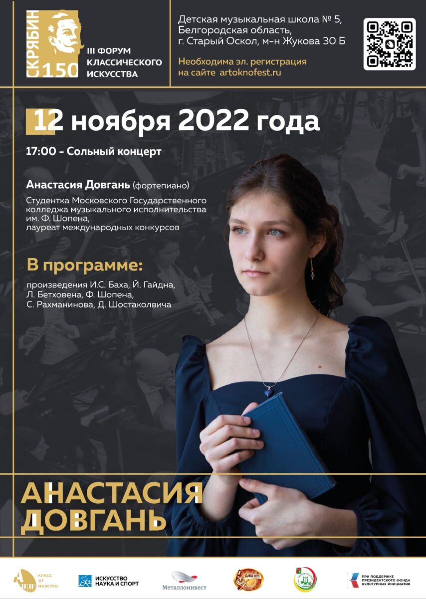 12 ноября 2022 года в 17.00 в Детской музыкальной школе №5 состоится сольный концерт Анастасии Довгань, лауреата международных конкурсов, студентки Московского Государственного колледжа музыкального исполнительства им. Ф. Шопена. В программе: произведения И.С. Баха, Й. Гайдна, Л. Бетховена, Ф. Шопена, С. Рахманинова, Д. Шостаковича.