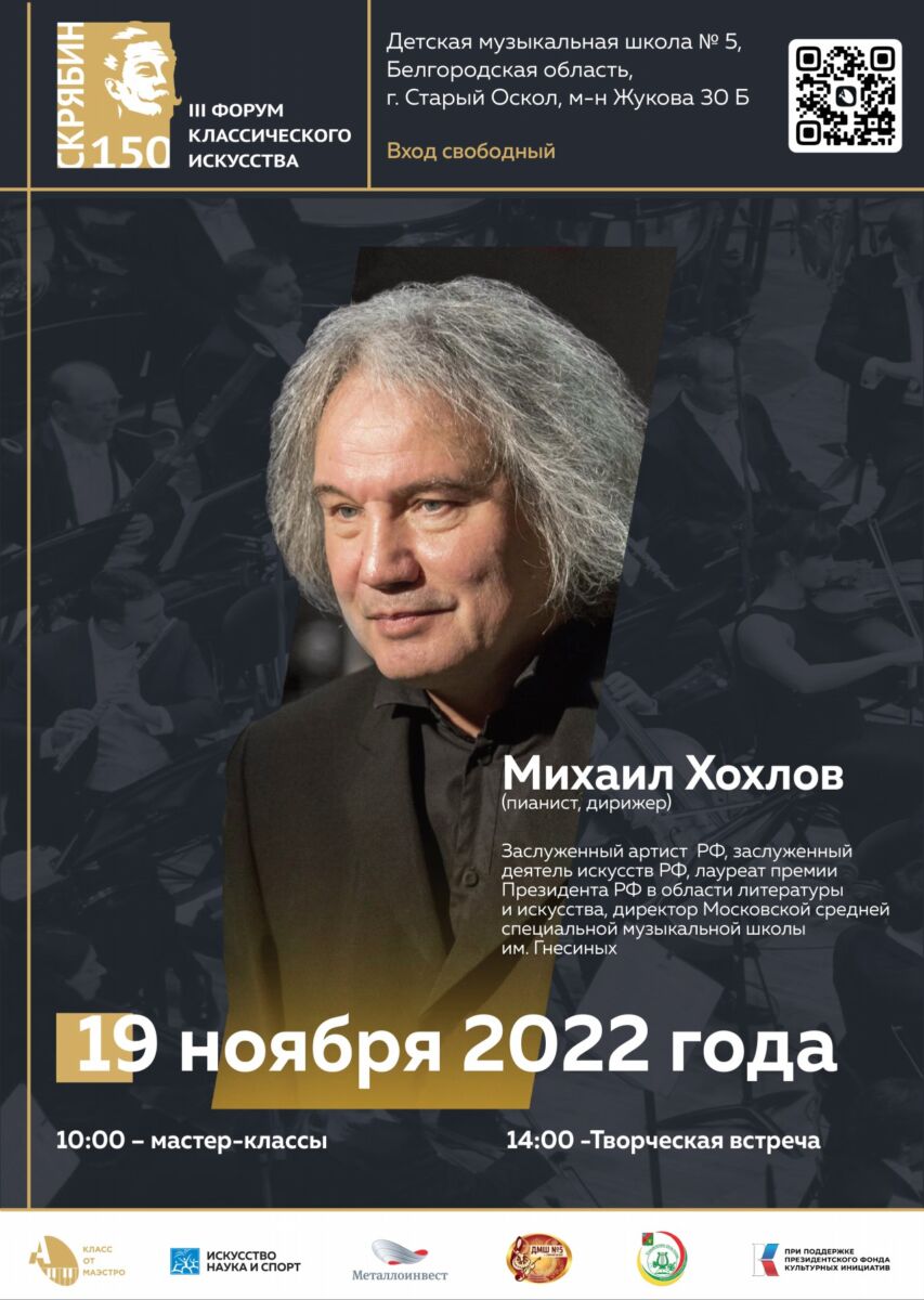 18-19 ноября в рамках Детского межрегионального Форума классического искусства, посвященного 150-летию со дня рождения А.Н. Скрябина, состоятся мастер-классы Михаила Хохлова, заслуженного артиста РФ, заслуженного деятеля искусств РФ, лауреата премии Президента РФ в области литературы и искусства, пианиста, дирижера, директора Московской средней специальной музыкальной школы им. Гнесиных.