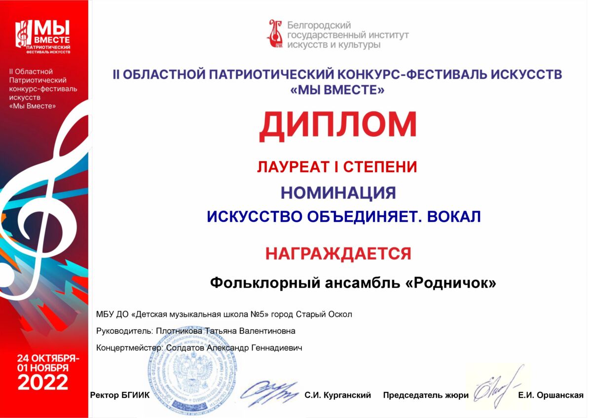 Поздравляем фольклорный ансамбль «Родничок» (руководитель Плотникова Т.В., концертмейстер Солдатов А.Г.) с победой в II Областном патриотическом конкурсе-фестивале искусств «Мы вместе». Желаем творческих успехов и новых побед!