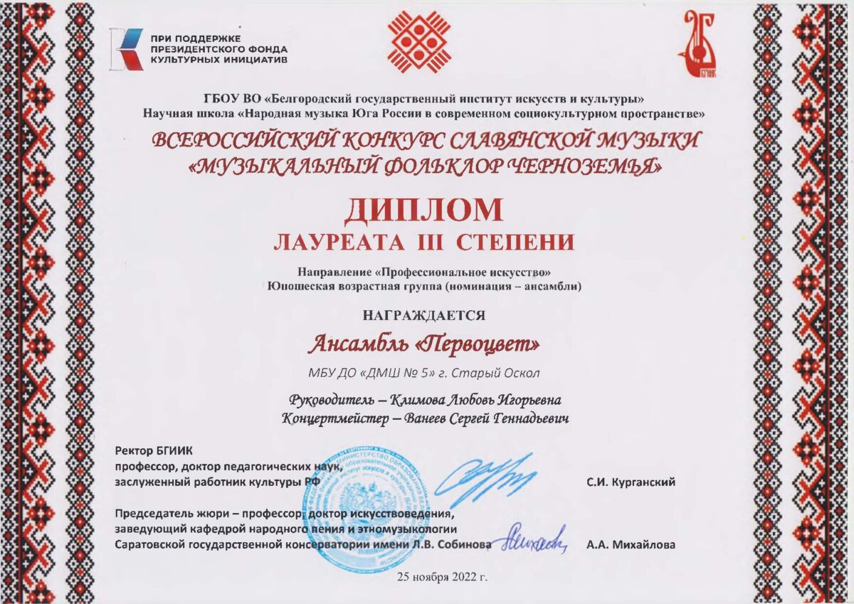 Поздравляем фольклорный ансамбль «Первоцвет» с достойным результатом! Коллектив стал лауреатом III степени (преподаватель Климова Л.И., концертмейстер Ванеев С.Г.). Желаем дальнейших успехов!!!