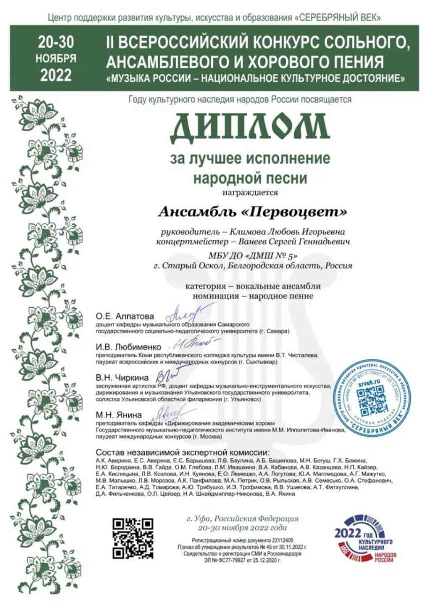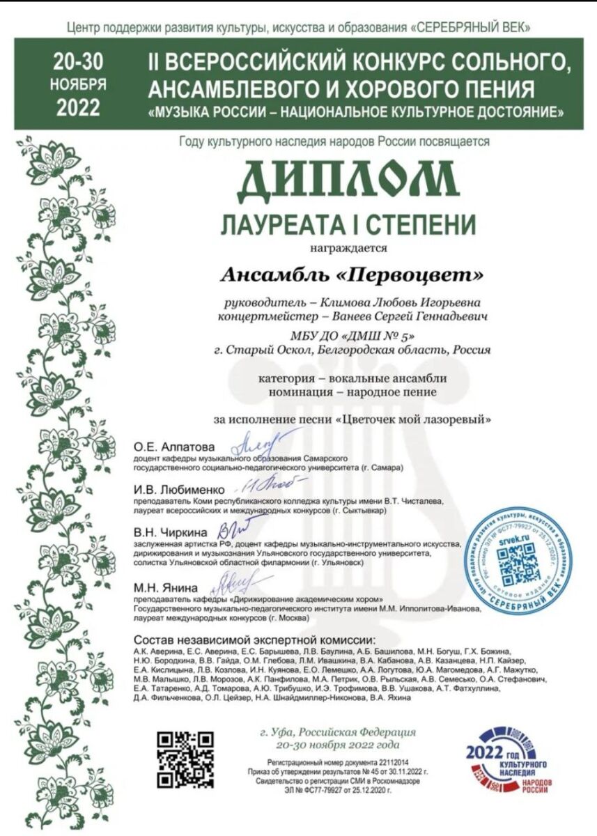 С 20 по 30 ноября в г. Уфа прошел II Всероссийский конкурс сольного, ансамблевого и хорового пения «Музыка России — национальное культурное достояние», в котором принял участие фольклорный ансамбль «Первоцвет».