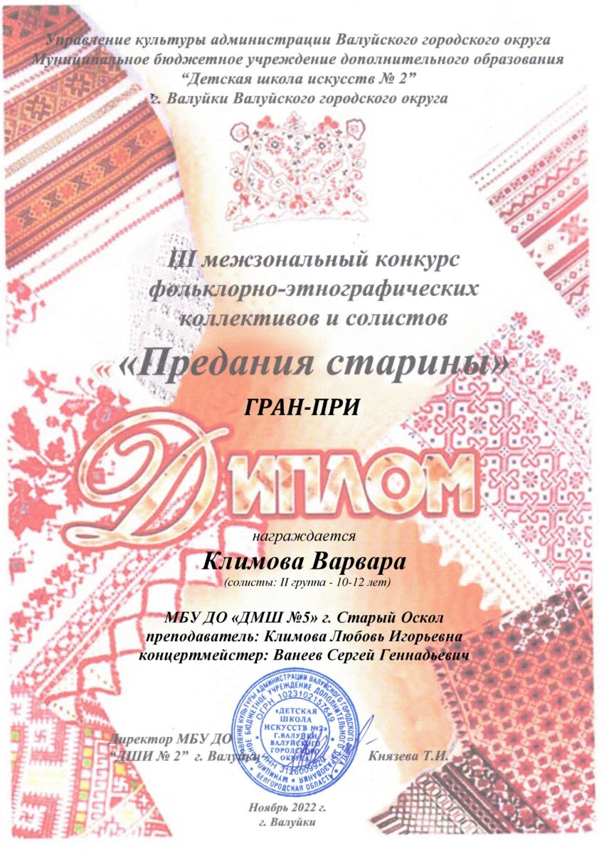 Учащаяся фольклорного отделения Климова Варвара стала обладателем Гран-при III межзонального конкурса фольклорно-этнографических коллективов и солистов «Предания старины».