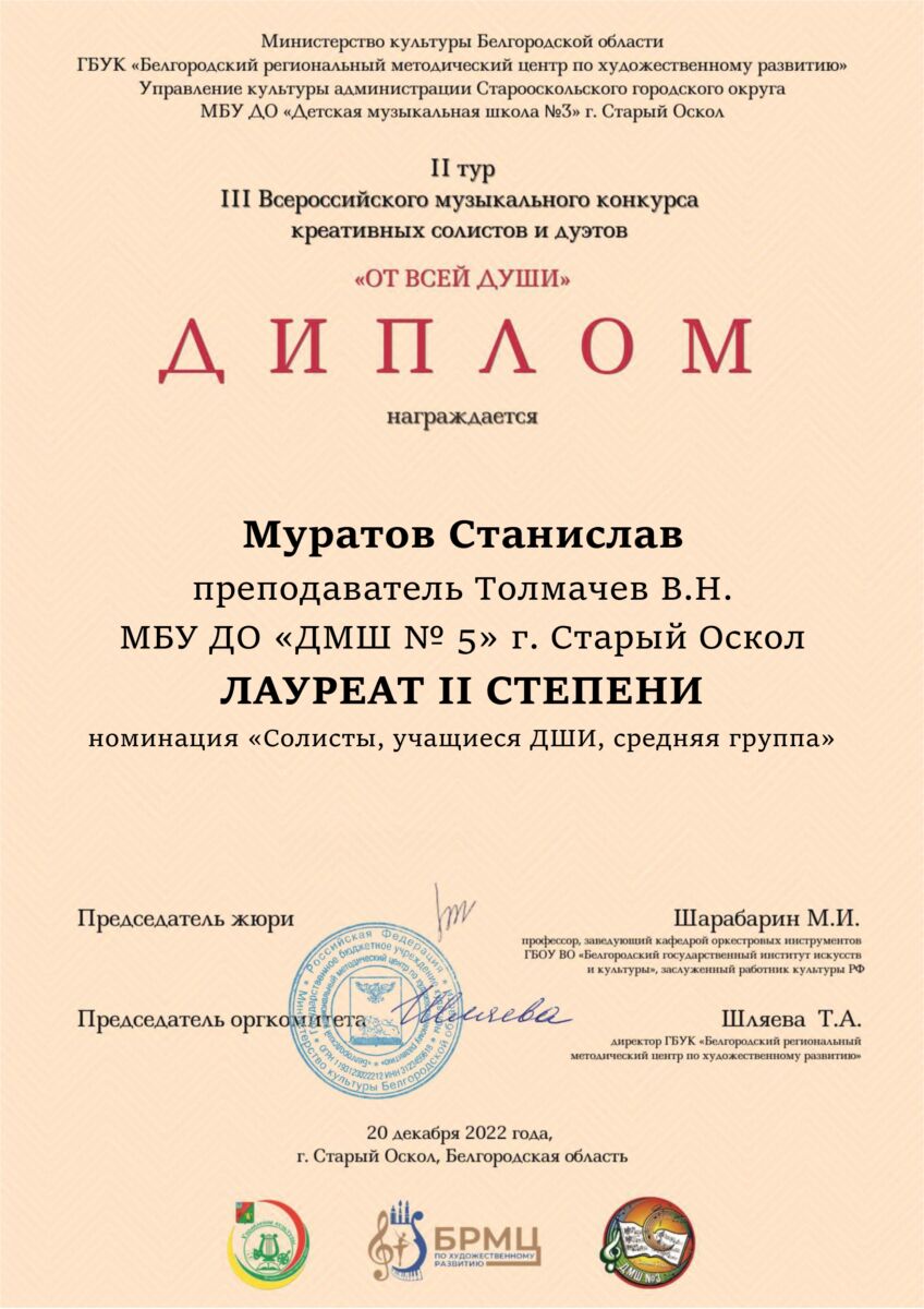 Поздравляем Муратова Станислава — лауреата II степени (преподаватель Толмачев В.Н.) с успешным выступлением на III Всероссийском музыкальном конкурсе креативных солистов и дуэтов «От всей души». Желаем успехов и дальнейших творческих побед!
