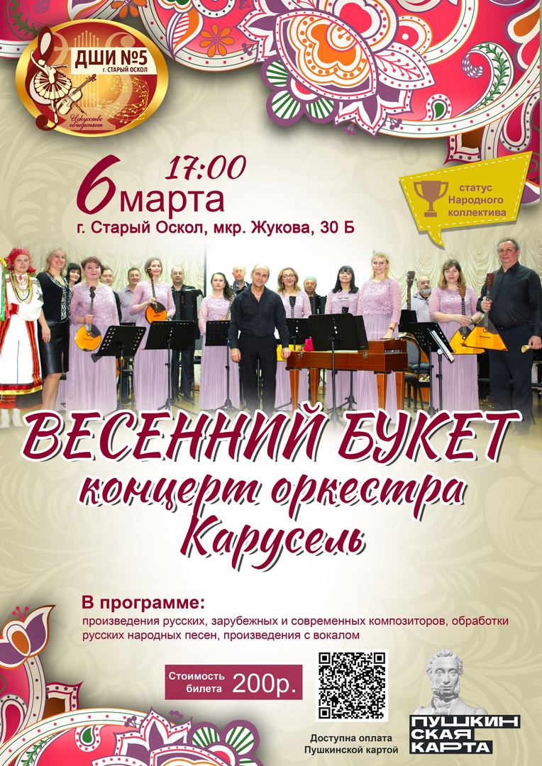 Дорогие друзья! Будем рады встрече с вами на концерте оркестра русских народных инструментов «Карусель».
