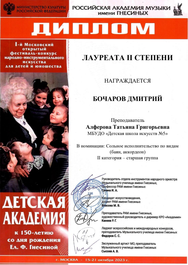Поздравляем учащегося народного отделения нашей школы Бочарова Дмитрия (аккордеон) преподаватель Алферова Т. Г. с удачным выступлением и присуждением звания лауреата II степени.
