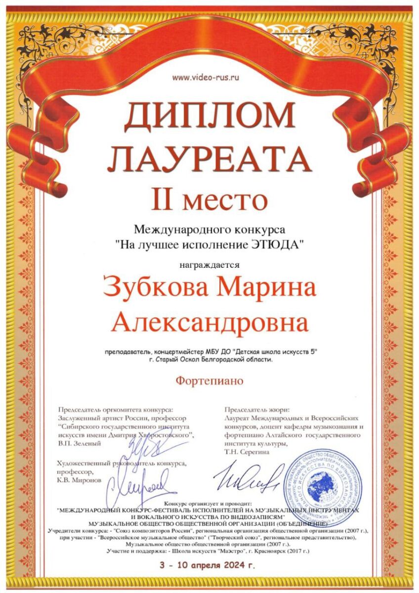 Поздравляем преподавателя и концертмейстера Зубкову Марину Александровну с получением звания лауреата II степени!