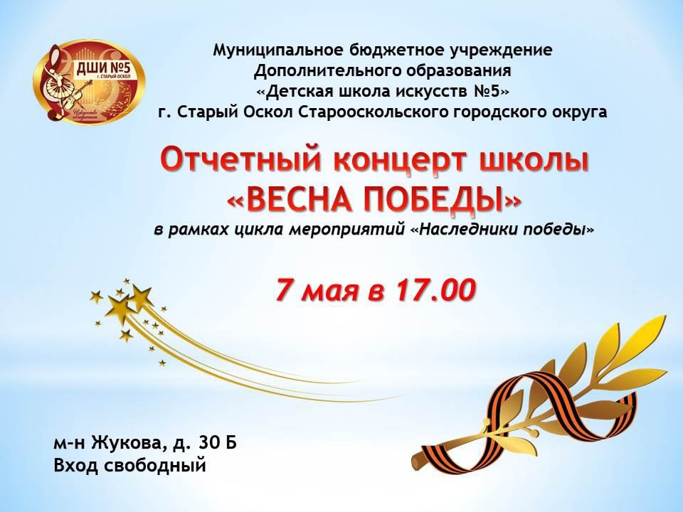 Дорогие друзья! 7 мая в 17.00 состоится Отчетный концерт Детской школы искусств №5 «Весна победы», который пройдет в рамках цикла мероприятий «Наследники Победы» . Приглашаем всех желающих на концерт! Вход свободный.