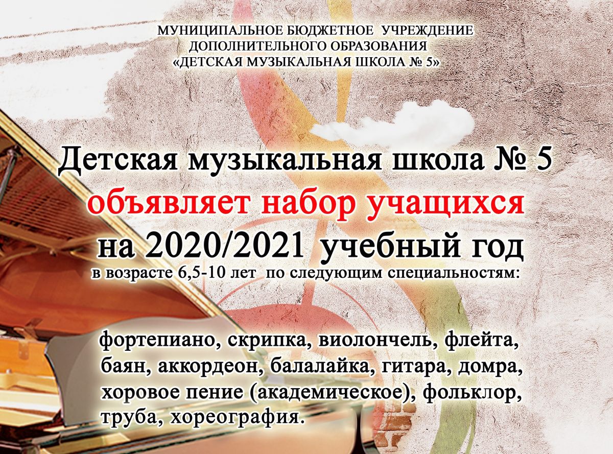 В связи со сложившейся эпидемиологической обстановкой вступительные экзамены в МБУ ДО «ДМШ № 5» переносятся на август. О дате проведения экзаменов будет сообщено на официальном сайте школы и в соц. сетях. Следите за объявлениями!
