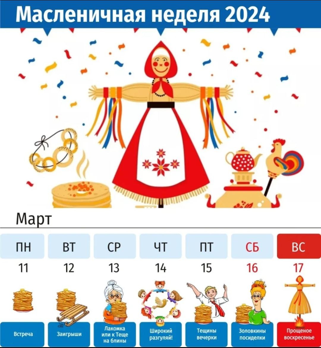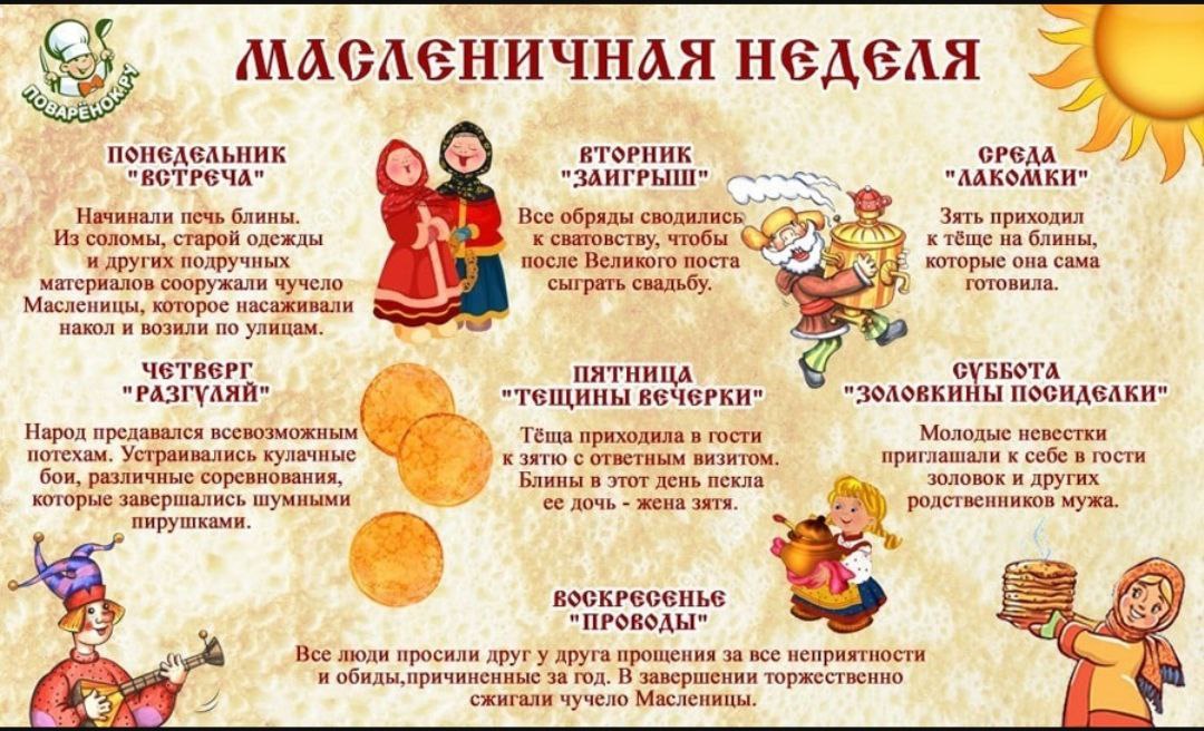 У каждого дня Масленицы есть свое название и особые традиции. Масленичную неделю принято делить на два периода: узкая Масленица и широкая Масленица. Узкая — первые три дня: понедельник, вторник и среда. Широкая — это последние четыре дня: четверг, пятница, суббота и воскресенье.