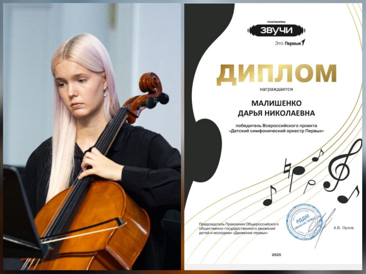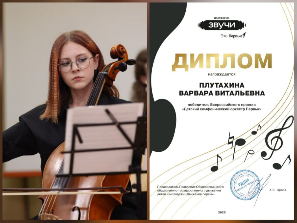 Мы поздравляем виолончелистов Малишенко Дарью и Плутахину Варвару (класс преподавателя Самойловой Ольги Александровны) и скрипачей Поварницыну Милану и Сазонову Елизавету (класс преподавателя Скибицкой Елены Александровны) с победой во Всероссийском проекте «Детский симфонический оркестр Первых!», который организован при поддержке платформы «Звучи»