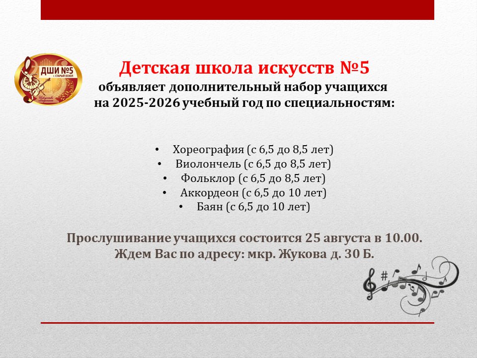Детская школа искусств №5 объявляет дополнительный набор учащихся на 2025-2026 учебный год по специальностям: